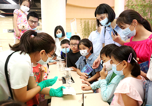 “我們?yōu)槭裁匆人薄凹抑凶詠硭兯{(lán)是什么原因”……在長江文明館臨展廳“武水講堂”正在進(jìn)行中。水務(wù)集團(tuán)水質(zhì)監(jiān)測中心工作人員講解了自來水水源地保護(hù)、原水取用、水質(zhì)檢測等相關(guān)知識(shí),并介紹了水務(wù)職工為市民日常生活及疫情期間所作出的貢獻(xiàn)。他們帶領(lǐng)小朋友們做了電解水實(shí)驗(yàn),并跟大家科普“現(xiàn)在社會(huì)上有些不良商販就是利用這個(gè)實(shí)驗(yàn)現(xiàn)象欺騙消費(fèi)者,希望大家通過今天的實(shí)驗(yàn)了解真相,不要上當(dāng)亂買凈水產(chǎn)品!”