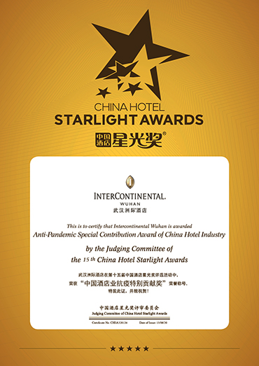 2020亞洲酒店及旅游論壇暨第十四屆中國(guó)酒店星光獎(jiǎng)評(píng)選,于2020年8月12日-14日在上海舉行,武漢洲際酒店榮獲中國(guó)酒店星光獎(jiǎng)――中國(guó)酒店業(yè)抗疫特別貢獻(xiàn)獎(jiǎng)。